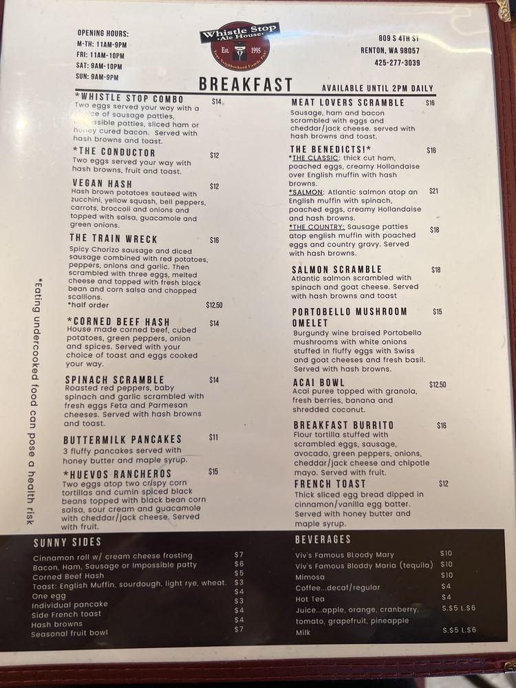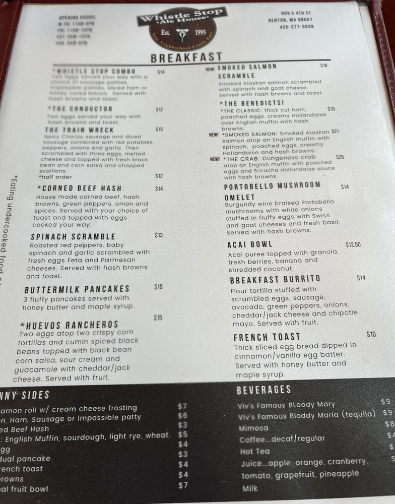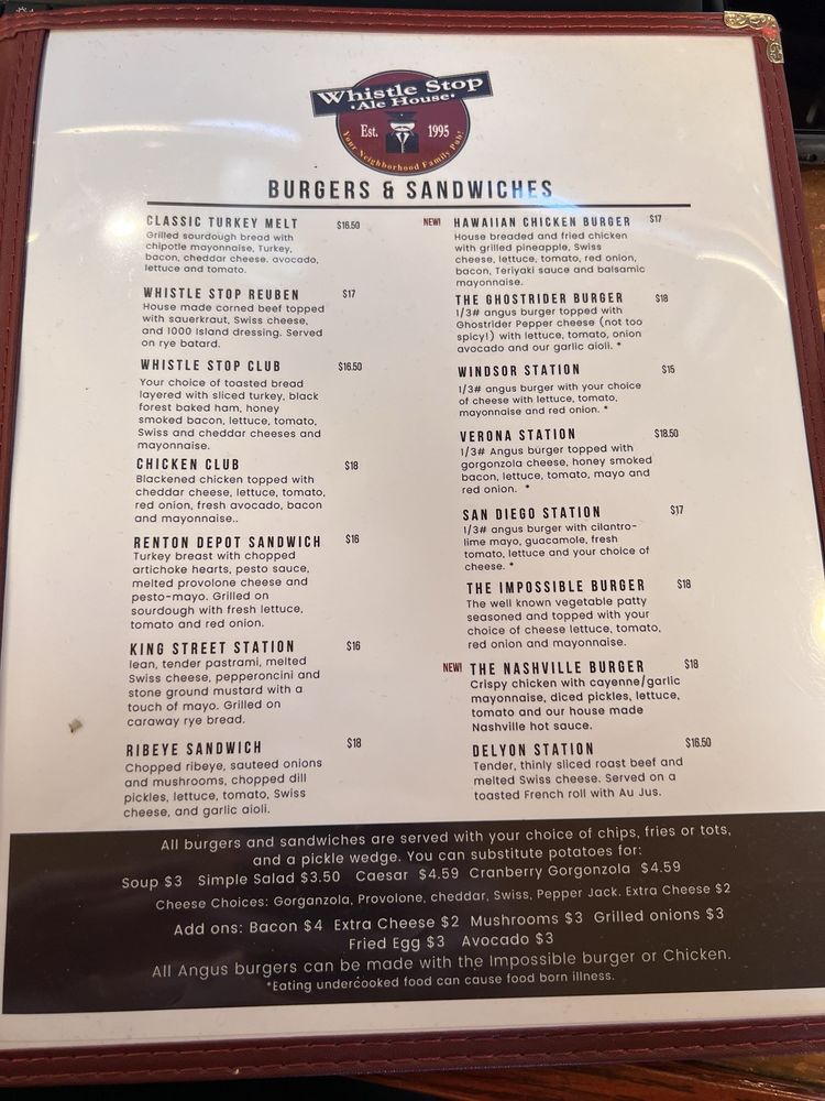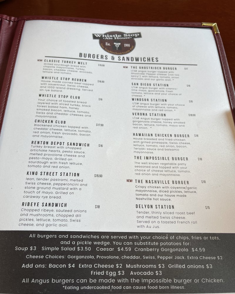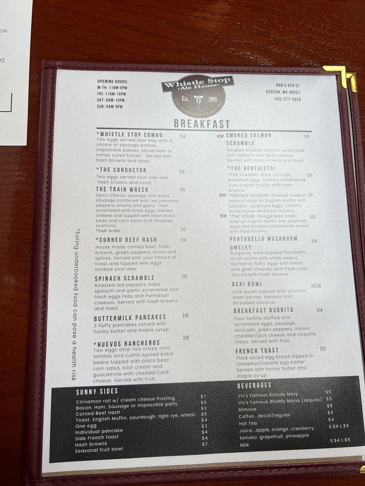 Whistle Stop Ale House in Renton, WA offers a casual American breakfast and brunch experience with a range of options. From deli-style sandwiches like the Whistle Stop Club and the Grand Central Station to flavorful salads such as the Cranberry Gorgonzola and the Southwestern, there's something for everyone. Tasty burgers like the Windsor Station and Osterport Station are also on the menu, along with a great selection of seasonal beers. Customers praise the friendly service, fun atmosphere, and delicious food, with standout dishes like the Nashville Hot sandwich and classic eggs Benedict. The outdoor seating is a plus, perfect for enjoying a meal in a chill environment. Whether you're a local or just passing through, Whistle Stop Ale House is a must-visit spot for lunch or dinner.